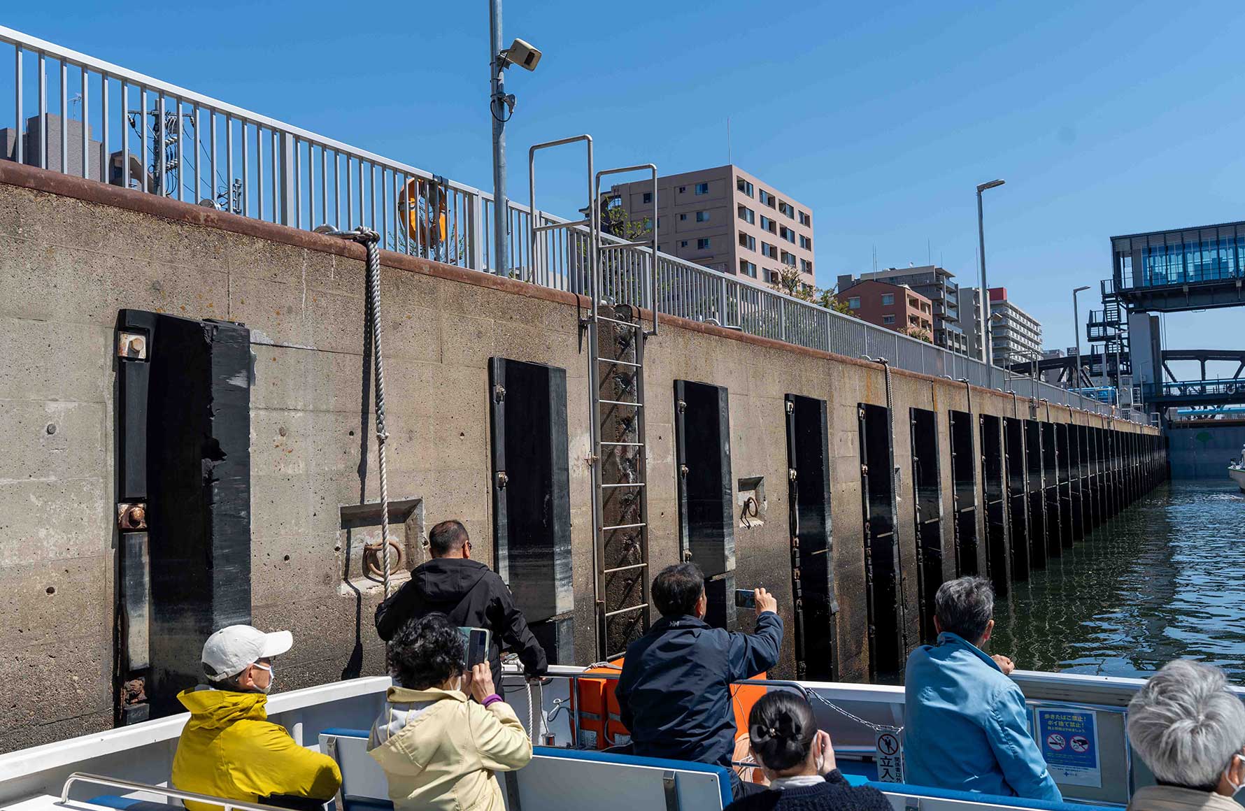 往復で閘門を通過し、水上交通ならではの迫力と仕組みを船上から間近にお楽しみいただけます。