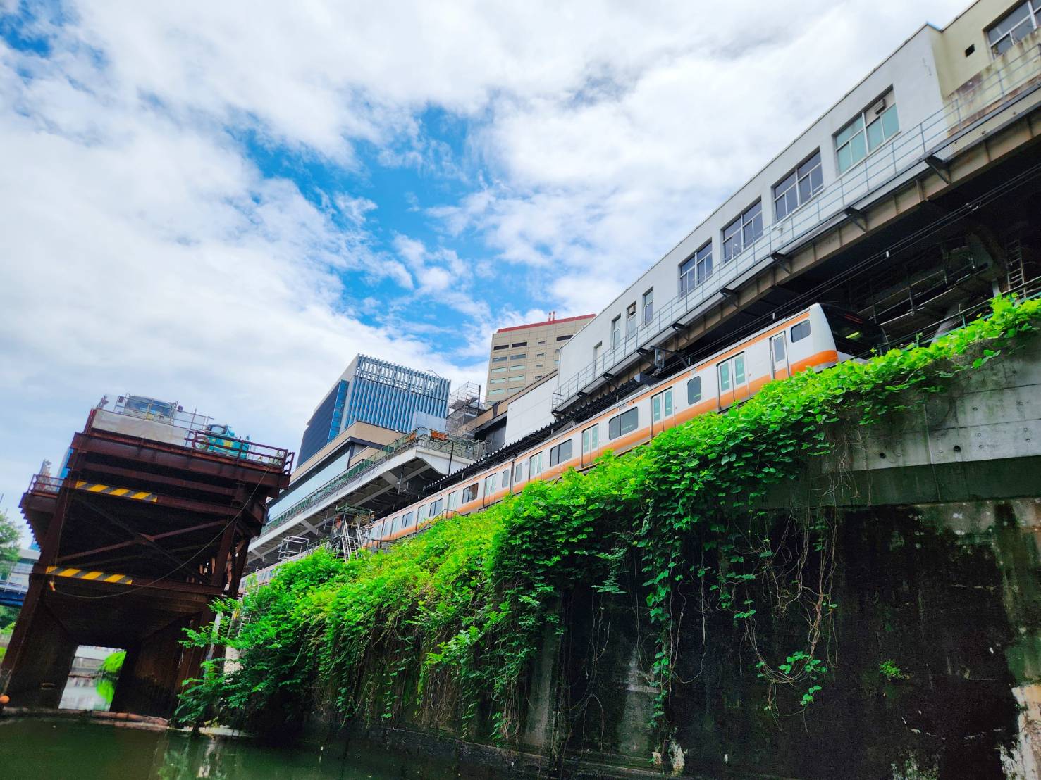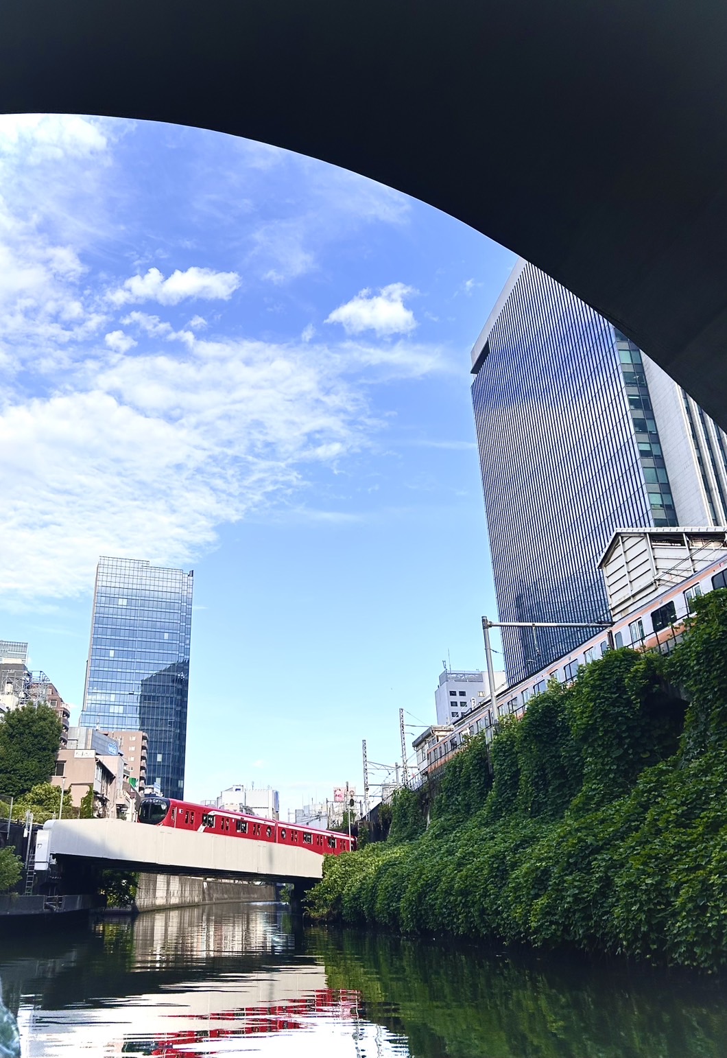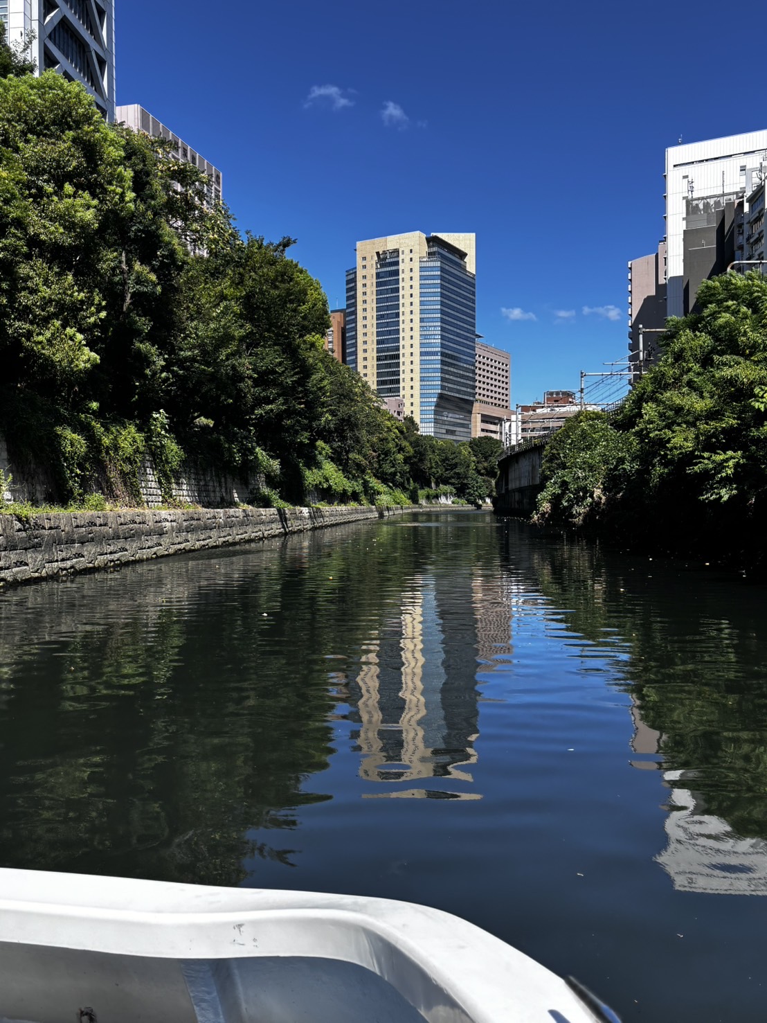 お茶の水渓谷での空の青、木々の緑、水面の静けさと水面に映るビルの陰、上下対照の景色の美しさに感動しました。