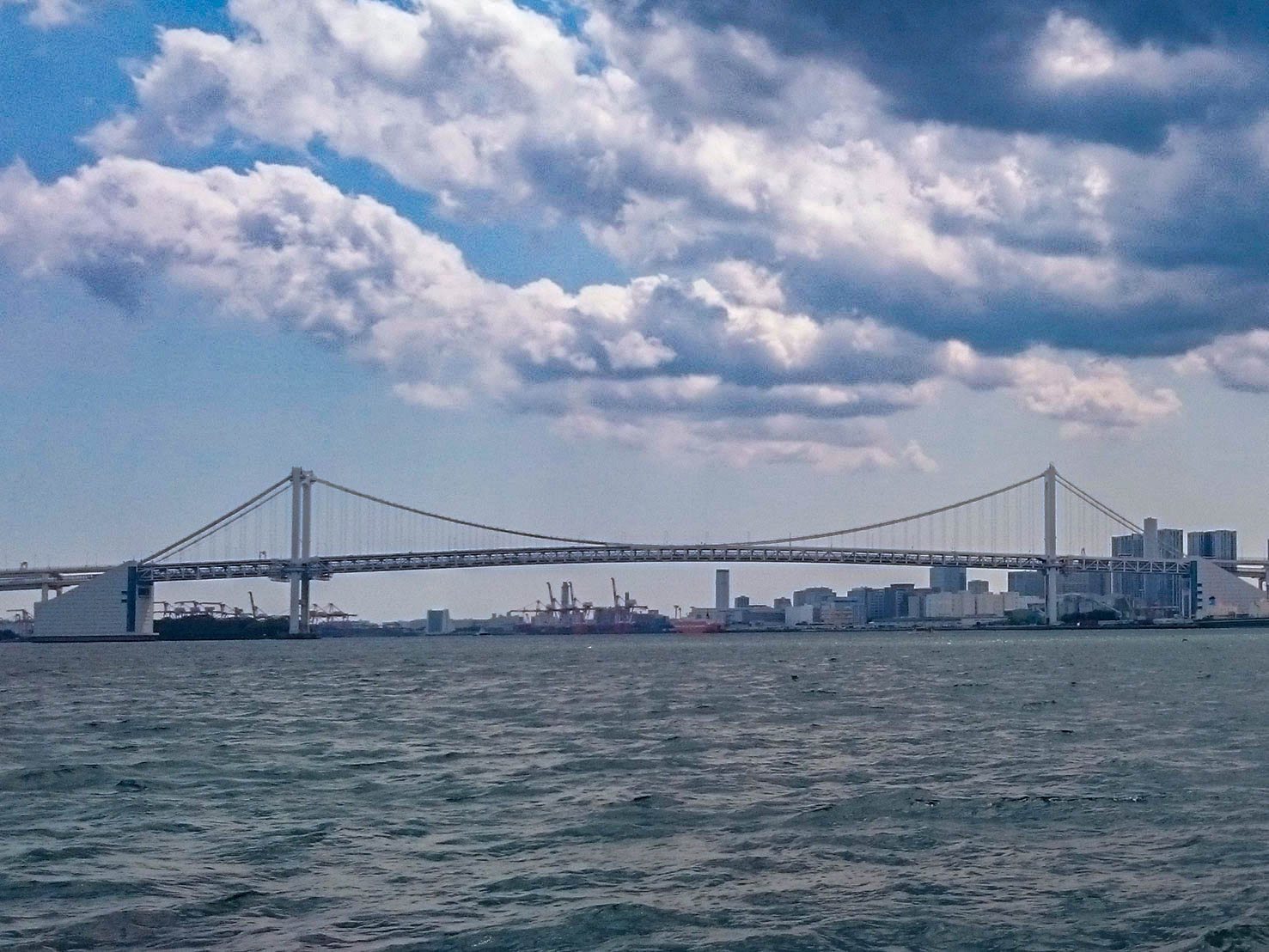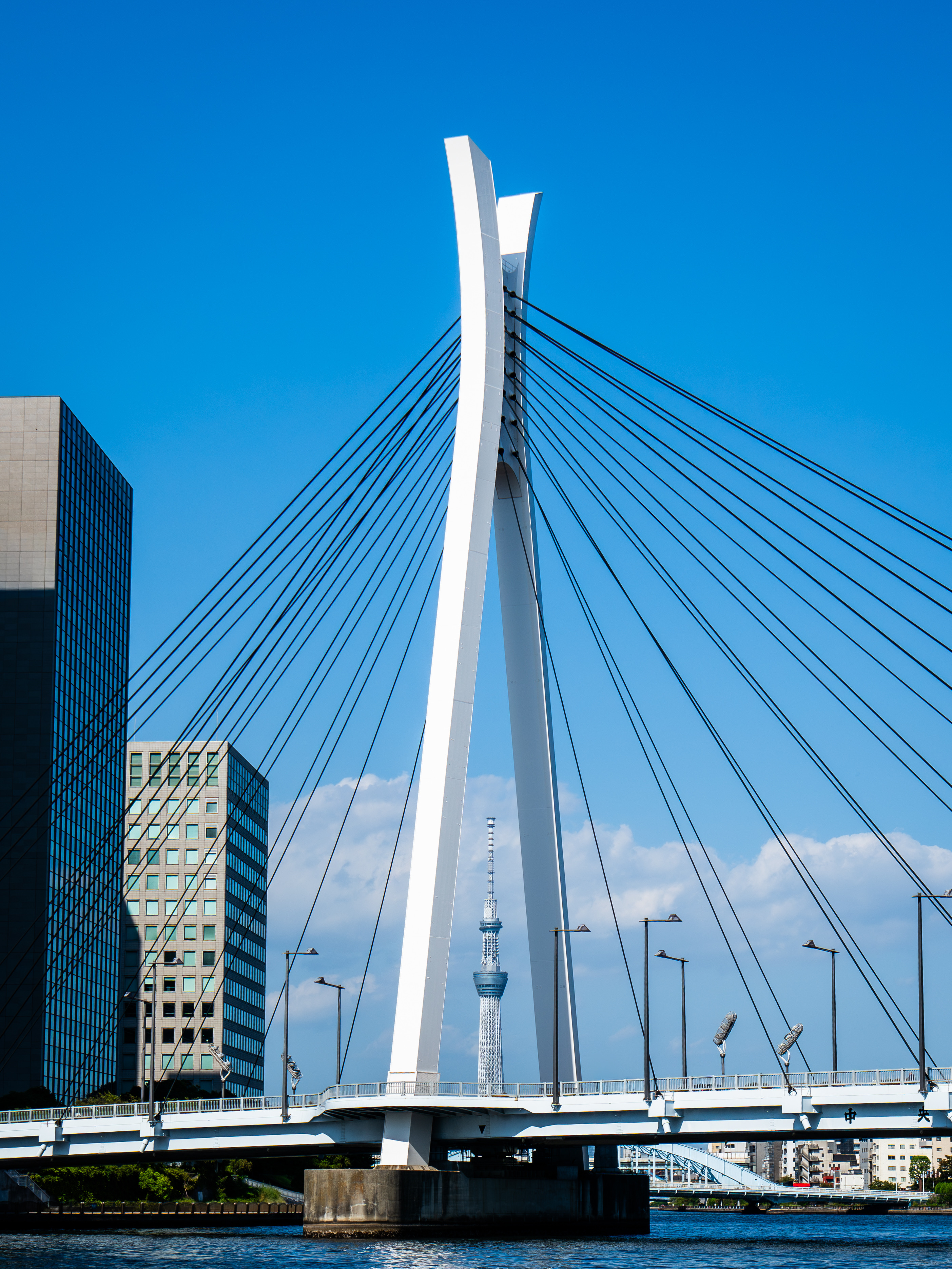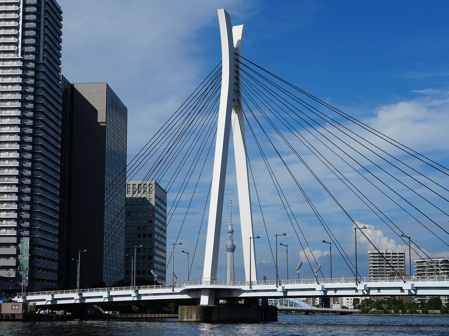 青空へ向かって伸びる橋の白い主塔とケーブルが、まるで都会のキャンバスに描かれた一本の弧のようでした。