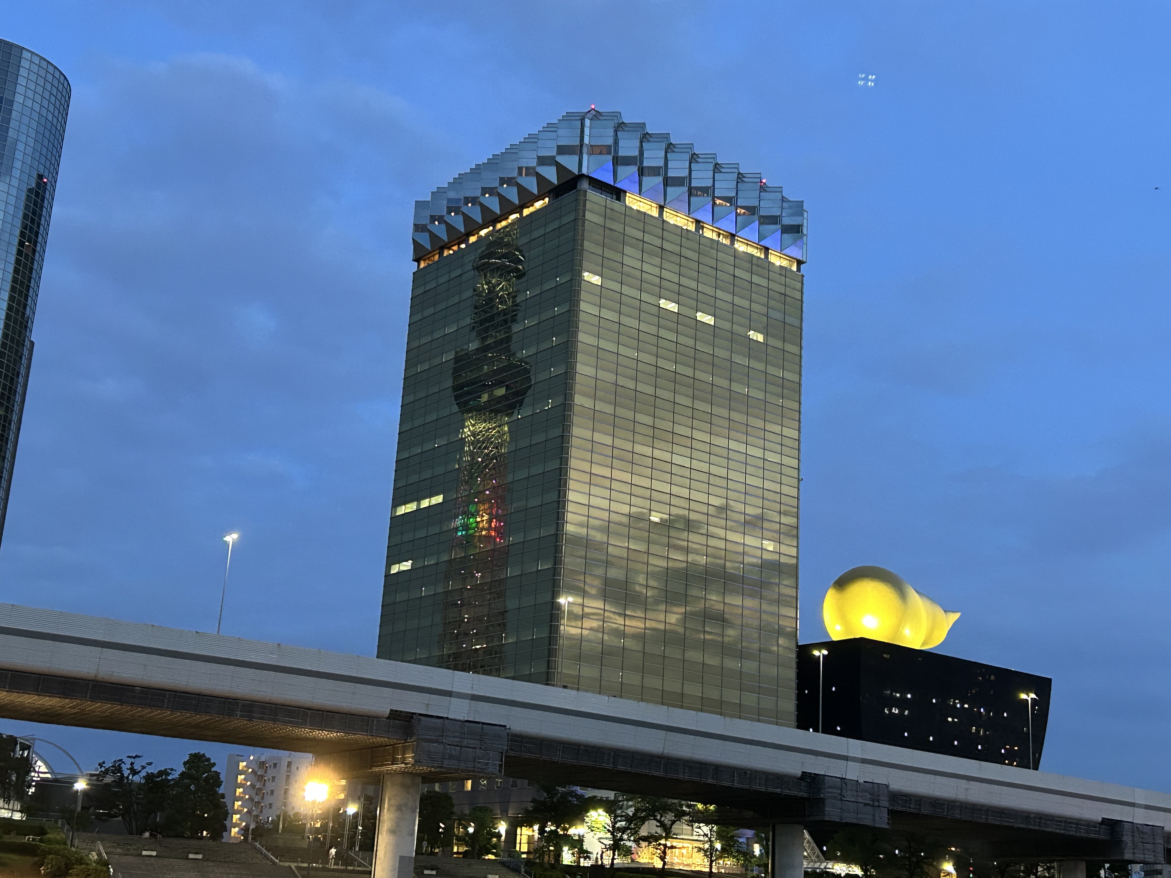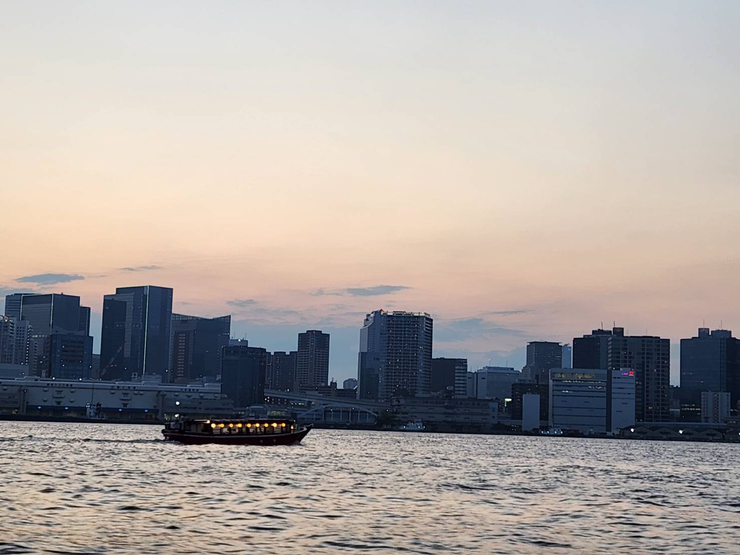 スカイツリーが遠くに静かに立ち、空と水面のグラデーションが綺麗でした。