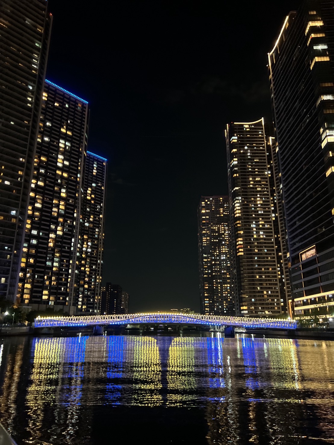 リフレクションで水辺に浮かぶのはビルではなく黄色と青の光というのが幻想的。景色と共に色が記憶に強く残っている。