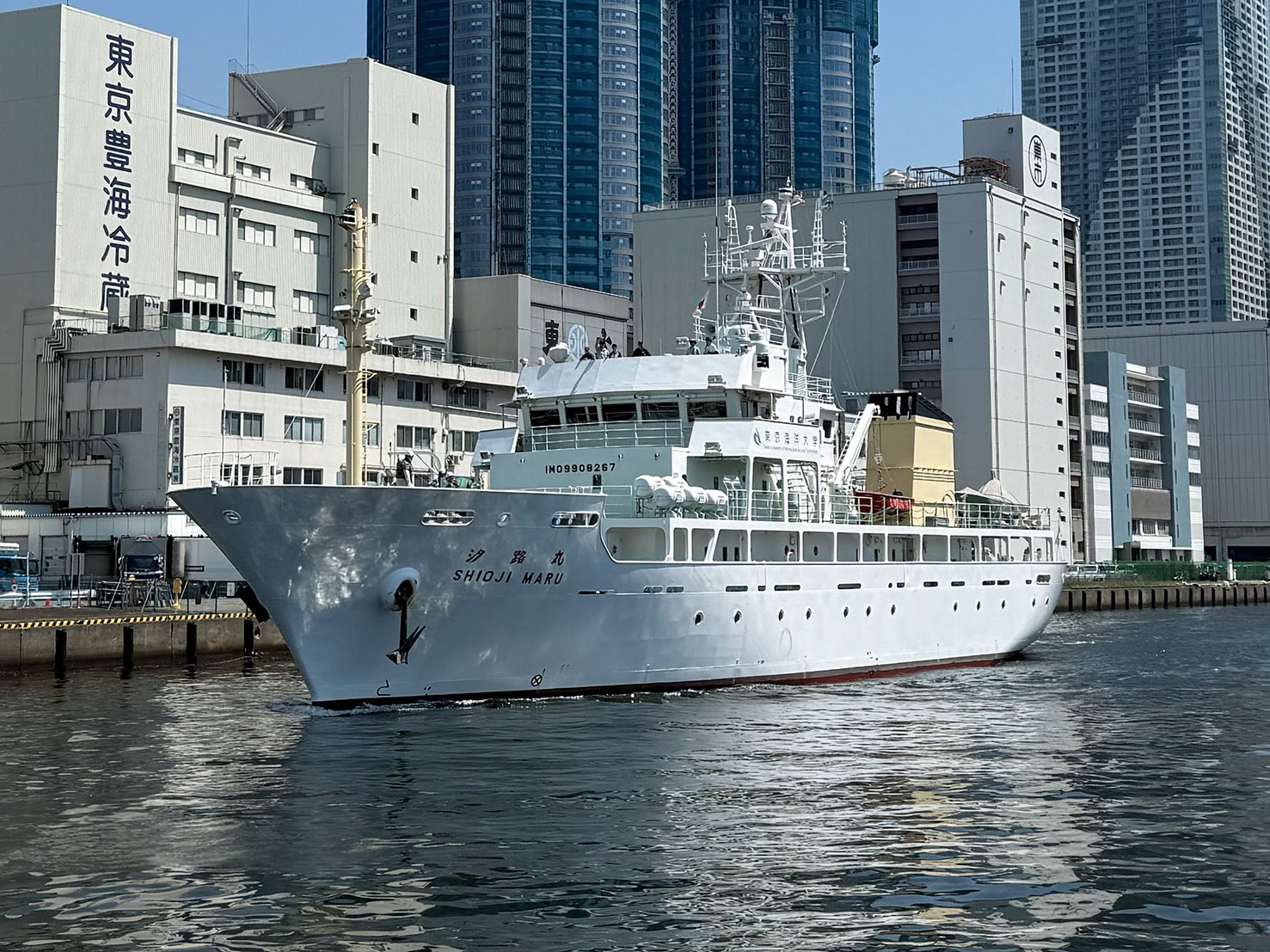晴れわたる都会の空の下、停泊する真っ白な船体が水面に凛と映え、周囲の高層ビル群との対比が印象的でした。