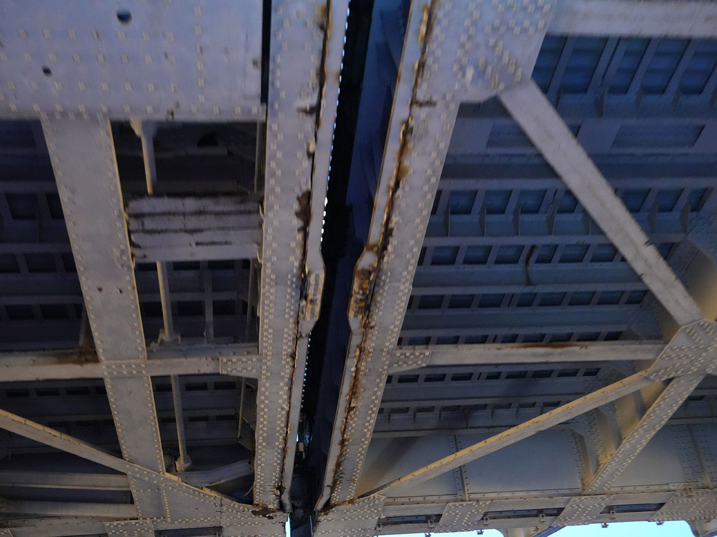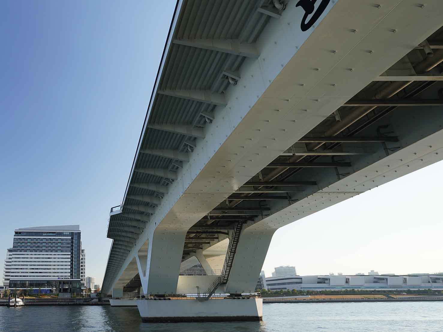 橋の真下から見上げた構造美に圧倒されました。まるで工業的なアート作品のよう。