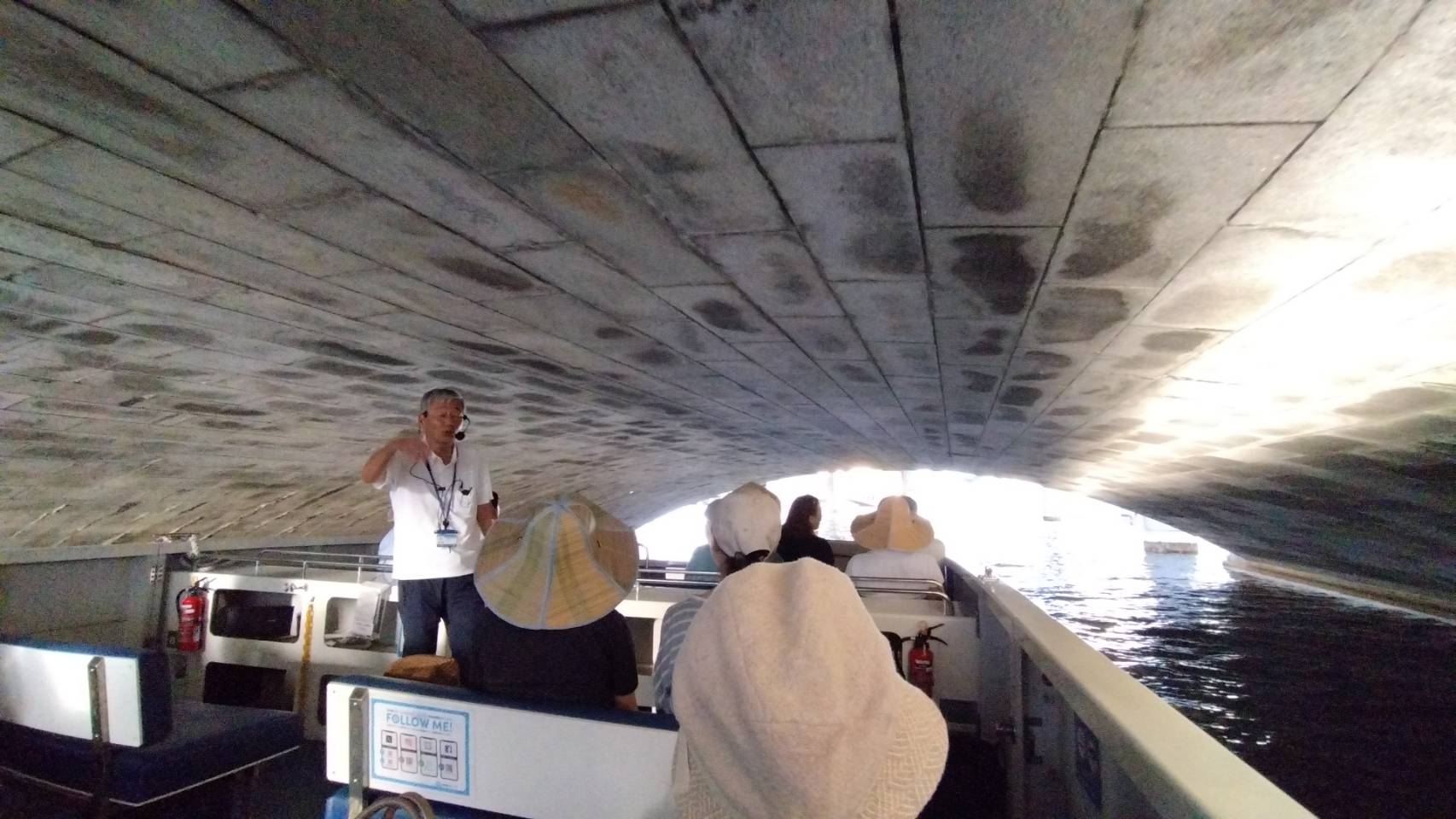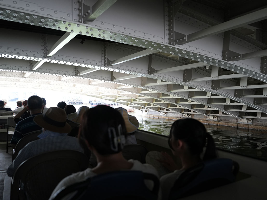 乗船客の視線が一斉に上へ。整然と並ぶ鉄骨と、水面に反射する光が独特の迫力を感じました。